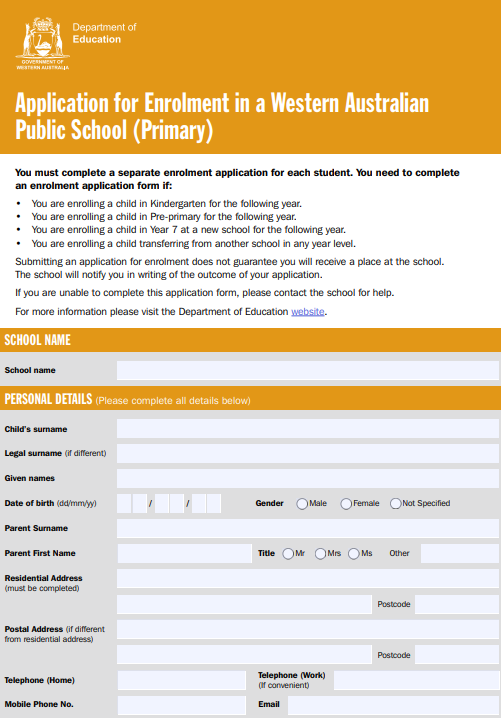 To enrol a new student, please click on the links below. For students enrolling into Kindergarten for the first time, please also complete the Application for Enrolment in a Western Australian Public School (Primary).